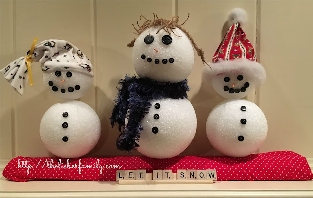 We cut a pool noodle in half and covered it with red fabric to have something for the snowmen to sit on. Then we took some old Scrabble times and spelled out "Let it Snow" to display in front.